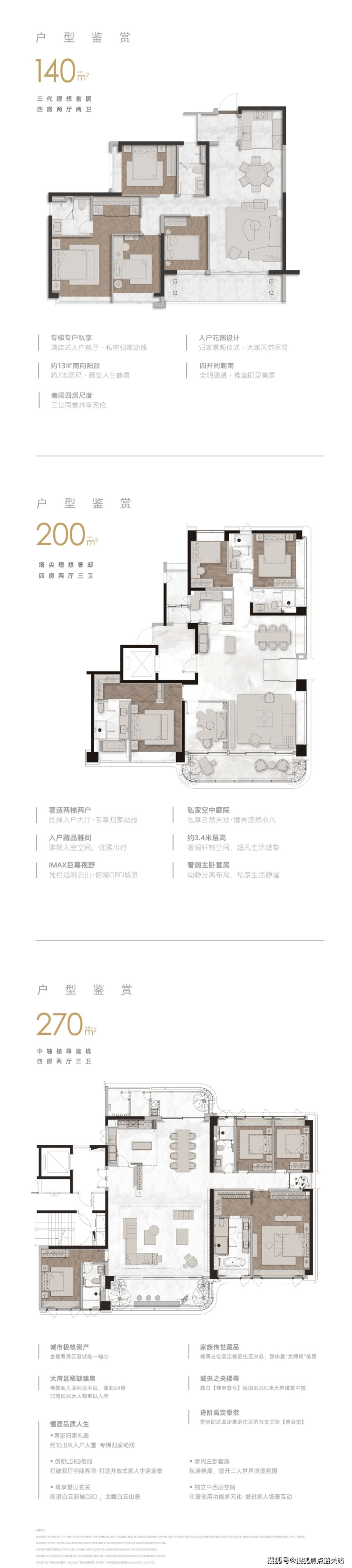 项目住宅部分由D1至D9共9栋25层至35层的洋房大平层组成,户型面积从140平方米到264平方米不等。每栋住宅均采用围合式布局,中央园林宛若城市绿洲,确保每一户都能享受到充足的采光和景观视野。