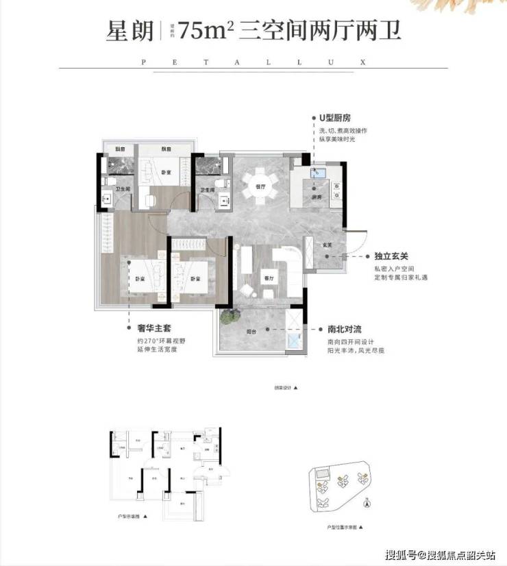 更绝的是75平可以做到,南北对流+3房2卫+独门独户,在很多楼盘里,小户型都是被牺牲的那一批,所以这里的小户型性价比很高。