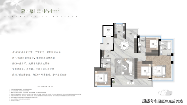 建面约164㎡4房3卫,四开间朝南,16.9米南向采光,270°景观大主卧。