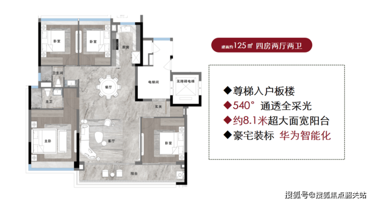 建面约125㎡4房2厅2卫,8.1米超宽大阳台。首推小面积四房产品。