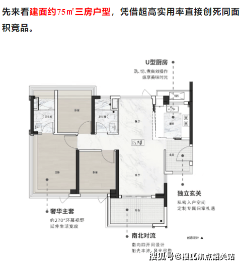 75平方米三房户型:独立玄关设计,U型厨房布局,南北对流,空间通透明亮,适合刚需家庭。