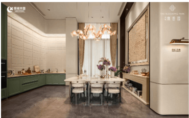 首层大堂的设计延续了整体的奢华风格。海浪绿岩板背景墙与杰尼亚灰石材通铺地面相得益彰,水刀拼花工艺展现出海派精致美学的独特魅力。地下光厅则延续了这一设计风格,海浪绿岩板搭配浪漫精致的海棠纹星空顶,营造出奢华酒店般的地库归家体验。从架空层到泛会所,馥香园以"繁花六集"为主题,创作出全新的社区邻里社交体验。咖啡吧、茶室让人享受悠然时光,书吧、会客厅采用半敞开式的空间规划,典雅的海派风情设计让人在欣赏园林景致的同时,感受内外交融的心旷神怡。