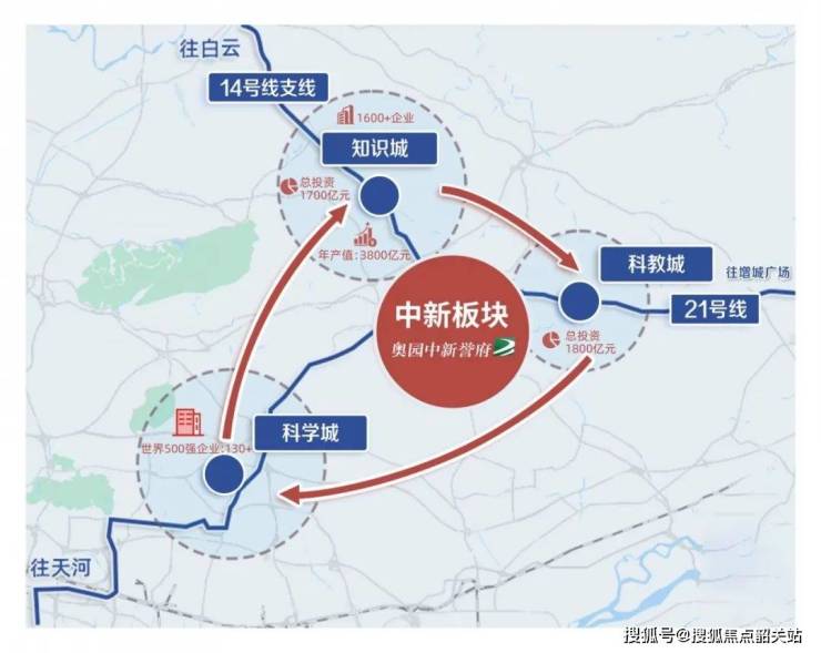 中新知识城、科学城、科教城三城交汇:奥园中新誉府位于这一黄金区域的核心位置,不仅是距离知识城最近的不限购板块,还受益于这些区域的高科技产业发展。