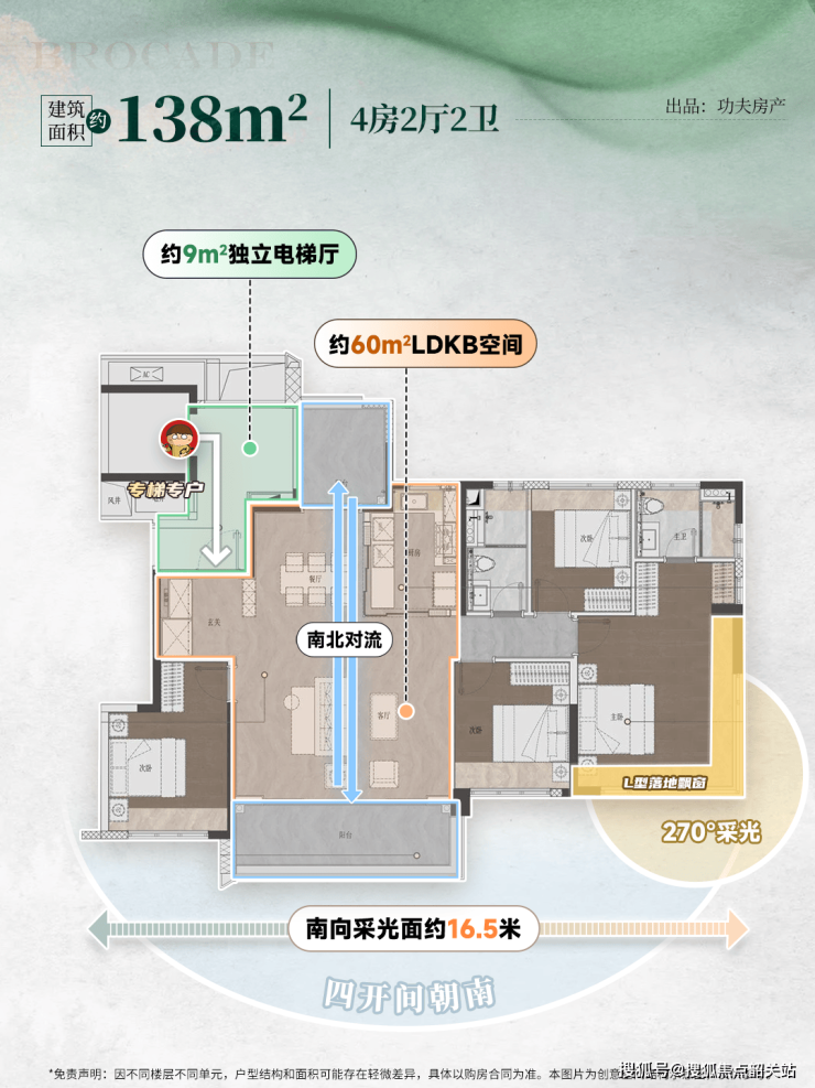 约138㎡南北对流四房:这是T2小高层板楼的明星户型。南北对流+双阳台设计,四开间朝南,南向面宽达到约16.5米,让阳光和清风成为日常。专梯专户设计,每户享有大于约9㎡的电梯厅,公区采用岩板砖背景墙、金属踢脚线,彰显尊贵品质感。