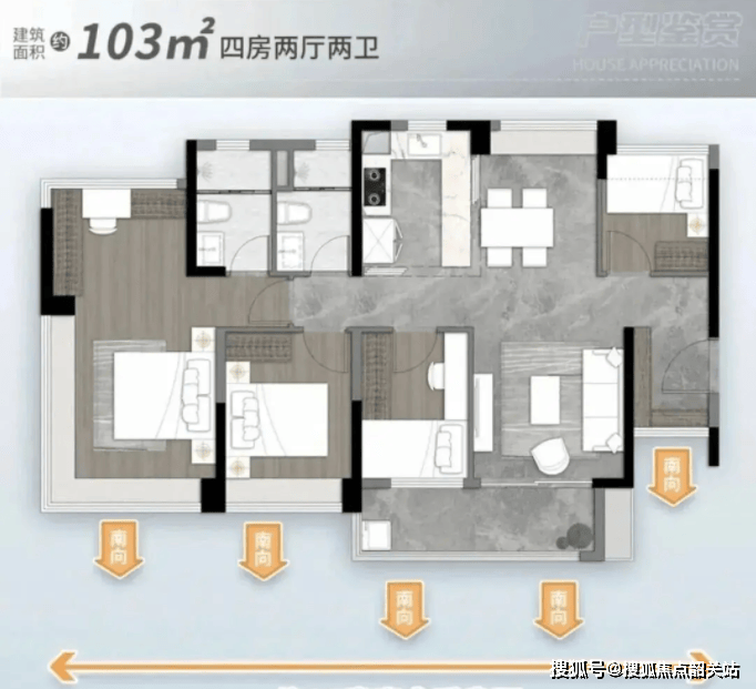 结构:横厅设计,五开间朝南(客厅+四卧室),采光面超14米,堪称“阳光收集器”。