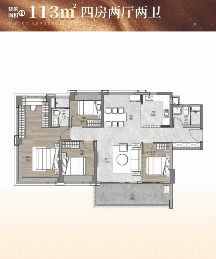 - 113㎡看江四房:五开间朝南,6.5米南向阳台,主卧配置步入式衣帽间及独立梳妆区,江景视野与功能分区兼备。