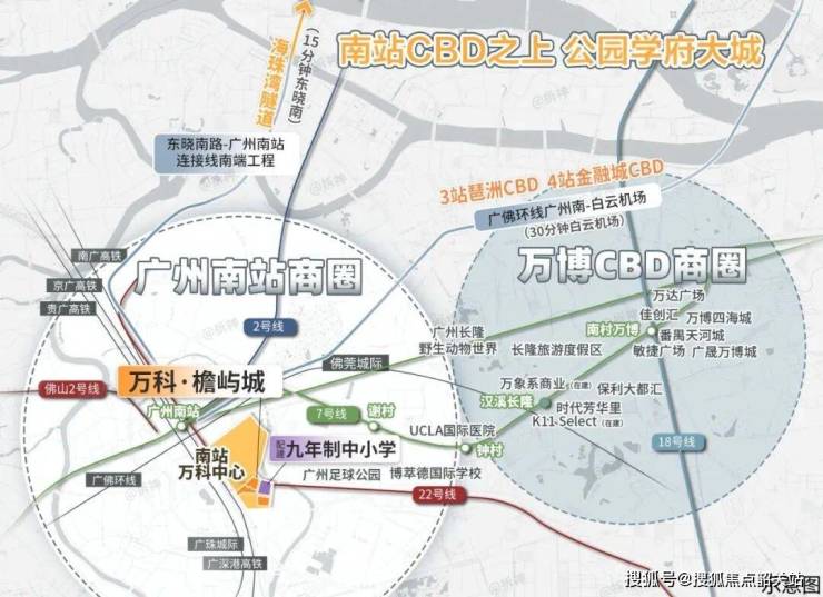 万科檐屿城位于广州南站CBD核心区,占据“珠江新城-南站万博CBD”双中轴交汇的核心位置,是广州“东进南拓”战略下的重点发展极。项目所处的番禺黄金8公里范围内,串联万博、长隆两大世界级商圈,覆盖区域70%的经济总量及常住人口,形成“超级枢纽+超级商圈”的复合价值优势。