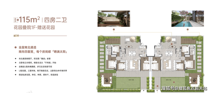 江玥上城的产品线分为三大系列,均围绕“最大化江景视野”与“提升实际使用率”展开。其中,“玥境”滨江小洋楼主打112–130㎡低密叠院,1F至4F各具特色:首层送双花园(赠送面积高达170㎡),使用率达262%;三层享南北双露台,单南向露台即达30㎡;四层复式结构则全赠顶层天台,使用率约242%。