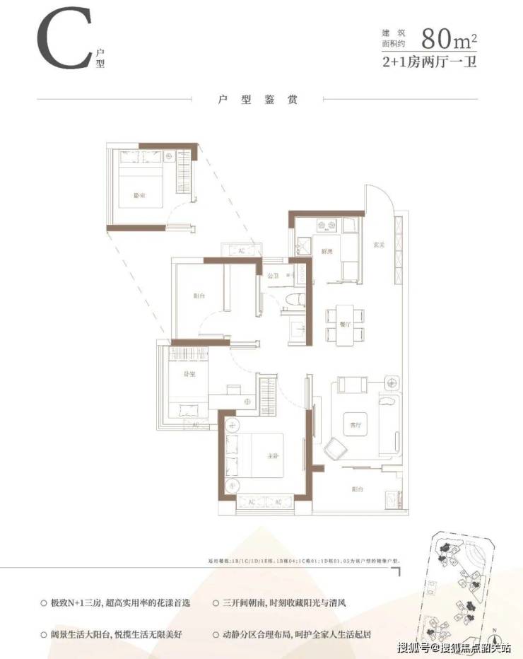 C户型:建面约80㎡ 2+1房1卫