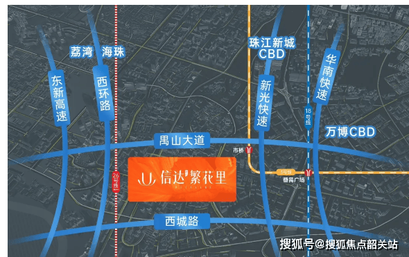 信达·繁花里地处番禺市桥核芯区域,禺山大道南侧,地理位置优越,交通路网四通八达,无论是公共交通还是自驾出行,都十分便捷。公共交通方面,步行约1.7km可达地铁3号线市桥站,1站长隆/番禺广场,换乘7号线2站可达万博CBD,3站直达海珠区,8站抵达珠江新城,轻松接驳18/22号线,通达广州各大核心区域,满足日常通勤、休闲出行需求。规划中的地铁26号线有望在禺山大道和西环路交界处设站,项目未来极大概率成为地铁上盖物业,交通价值进一步提升。自驾方面,项目临近禺山大道、西环路两大主干道,接驳东新高速可快速抵达荔湾、海珠区,接驳新光快速可直达万博CBD、珠江新城CBD,全程无拥堵死角,轻松实现全城通达,同时周边路网完善,日常出行便捷高效。