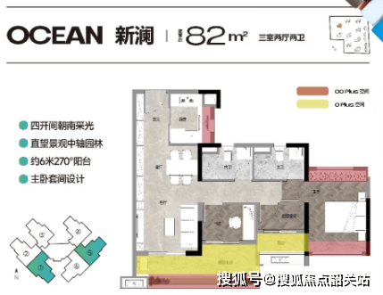 82㎡三房两卫:四开间全朝南设计,南北通透,主卧套间设计,配备约6米长超大阳台。