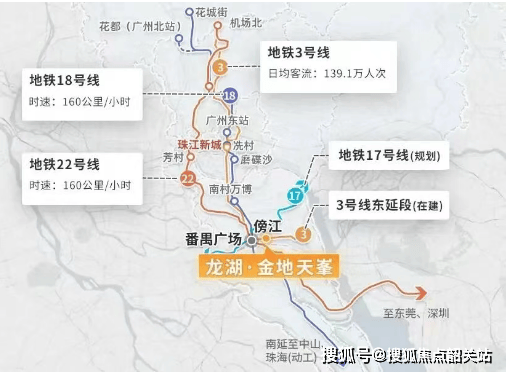 项目与3号线东延段傍江站无缝对接,小区电梯直达地铁站,无需担心刮风下雨。从小区出发乘坐地铁去番禺广场仅需一个站,前往珠江新城也不需要换乘。此外,周边还有地铁18号线、22号线、3号线东延段以及规划中的17号线,形成五轨交汇的交通枢纽。