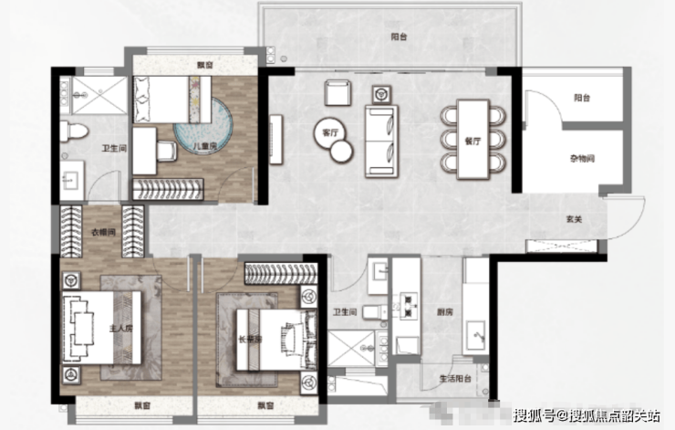 125㎡四房两厅两卫:正南北横厅户型,客餐厅一体设计,明亮阔绰。双阳台南北对流,通风与采光条件优越。超6米的景观阳台能够直接观赏大夫山湖头排景观,全屋飘窗面积赠送,实用率超过80%。