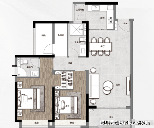 105㎡三房两厅两卫:此户型为纯南向且三开间朝南,超宽楼距确保视野开阔与采光充足。客厅宽度达3.9米,采用动静分离的设计,双阳台设计可欣赏一线园景与山景。