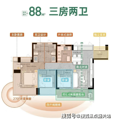 约88㎡三房两卫:紧凑实用,适合刚需家庭,提供舒适的居住体验。