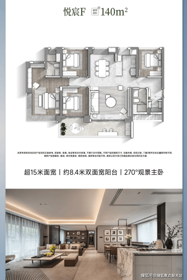 【悦宸 F 户型 建筑面积约 140㎡】:约 4.85 米客厅开间,客餐厨阳 LDKG 游动线;南北对流主卧,三面窗 270° 采光;厅卧空间灵活改造,约 8.4 米双面宽阔景阳台;客厅卧室连通可改约 8 米大宽厅,尺度奢适。