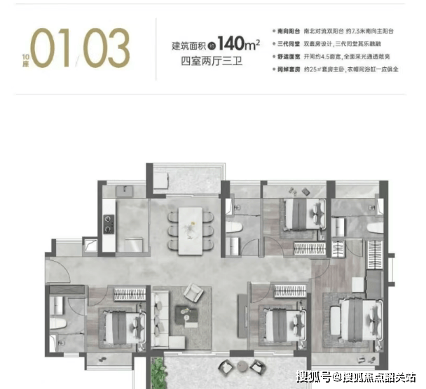 140㎡四房三卫:这款户型是大良同面积段唯一双主套设计,特别适合三代同堂的家庭,确保每个家庭成员都有足够的私人空间,互不干扰。