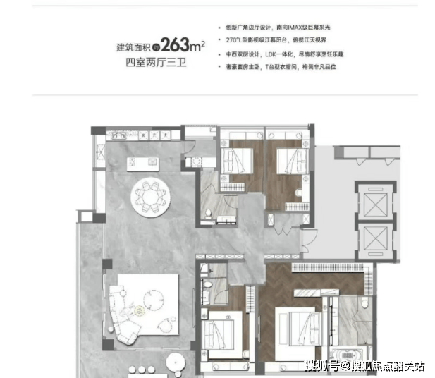 263㎡四房双主套:作为奢华江景大平层,263㎡户型不仅享有壮观的城市天际线视野,还提供了极致的生活享受,是追求高品质生活的家庭的理想之选。