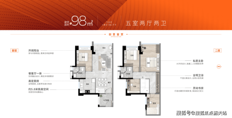 建面约98㎡复式:五房两厅二卫,实用率高达130%,双层设计可改造成5-6房。
