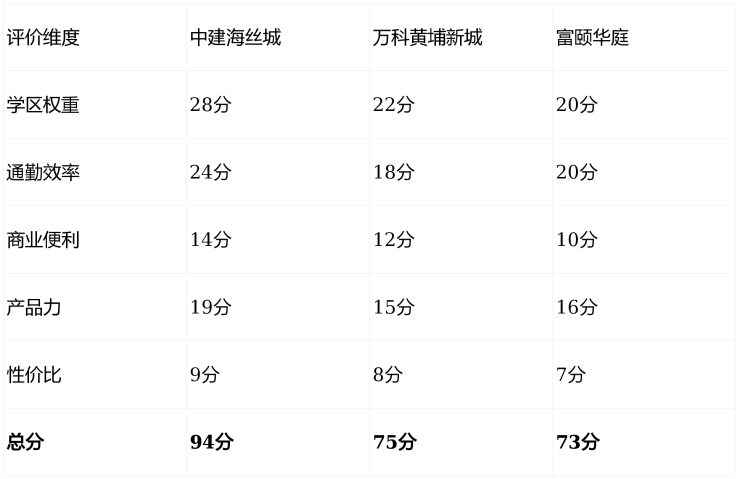 为帮助购房者更直观地对比,我们创建了"居住幸福度系数"评价体系,从学区、通勤、商业、产品力、性价比五个维度打分(满分100分):