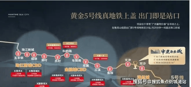 中建海丝城首推组团与地铁5号线双沙站B口直线距离仅50米,是广州主城区罕见的"真地铁上盖"项目。通过5号线可2站直达鱼珠CBD、5站金融城、6站琶洲东区、10站珠江新城,更可无缝换乘7/13/4号线,形成覆盖天河、黄埔、番禺的30分钟通勤圈。自驾方面,项目周边黄埔东路、广园快速、广澳高速等主干道构成"三横两纵"路网,实测早高峰前往珠江新城仅需28分钟(2026年1月百度地图数据)。