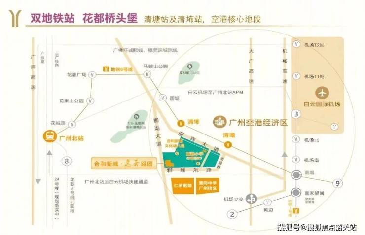 合和新城位处花都区迎宾大道3号,为花都出入市区必经之路,立足于花都空港经济核心区域,广州地铁九号线清塘站、清㘵站双站口旁,交通优势尽显,无可取代的黄金地段。