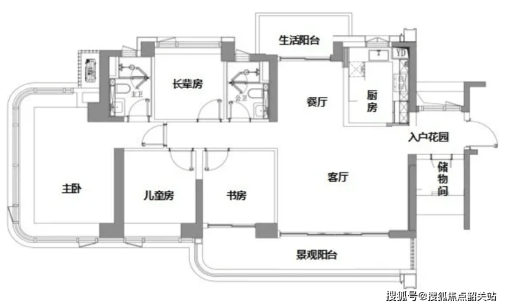 143㎡四房两卫:空间更加阔绰,生活阳台与景观阳台相呼应,增加了空间的通透感