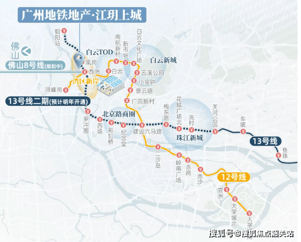 在交通方面,江玥上城展现了“地铁上盖”的绝对优势。项目直接位于13号线二期凰岗站的地铁上盖。13号线二期作为贯穿广州东西向的交通大动脉,其重要性不言而喻。预计在今年年底,这条线路将正式开通运营。届时,业主下楼即是地铁站,无需风吹日晒,即可快速通达天河、黄埔等核心商务区,通勤效率将得到质的飞跃。