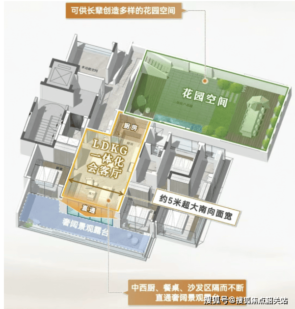 该户型采用了类四代宅的设计理念,错层通高阳台是其最大的亮点。这种设计不仅打破了传统阳台的沉闷,更让绿植得以垂直生长,营造出“空中森林”的视觉效果。私梯入户的设计,提供了一个约10平方米的独立电梯厅,这部分空间完全可以自用,增加了收纳功能或作为玄关缓冲区,极大地提升了居住的仪式感和便利性。