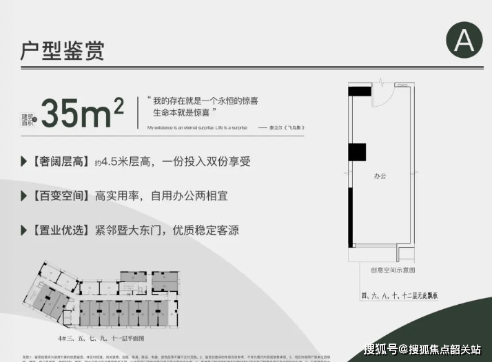 产品为建面约35-61㎡、4.5米层高的复式公寓,毛坯现楼交付。约35㎡户型有A(双钥匙设计,可分租) 和B(Loft中空) 两种选择,灵活性极高。约46㎡户型为一层一户,部分享有一线公园景观。最稀缺的是13层顶楼的约48㎡(仅4套)和约61㎡(仅1套)户型,全部为带私家露台的绝版设计,俯瞰中央公园。