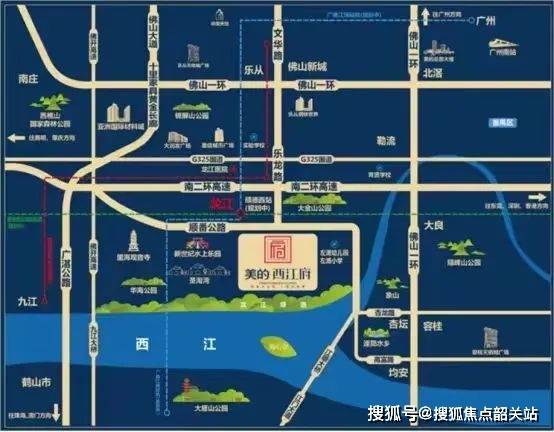 美的·西江府位于顺德外围板块,旁边是龙江的富人区圣淘湾,以一线江景为卖点。