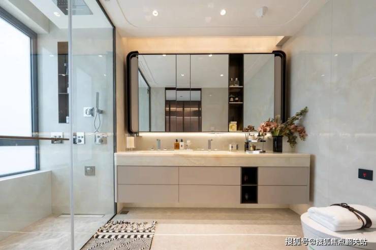 此外,项目在用材用料上极为考究。主卧的皮革背景板,由荔枝纹和油蜡纹两种纹理的皮革拼接而成,在暖光照射下,呈现出丰富有趣的质感变化。客厅地面采用 90x180cm 的瓷砖密缝铺贴,主卫墙壁则使用 120x270cm 的岩板,远超常见规格的材料,不仅使空间拼接极少,视觉效果浑然一体,而且在运输过程中需要借助吊机运送上楼。为了给客户提供更多选择,西派天河序在交标上几乎不惜成本,展现出对品质的执着追求。