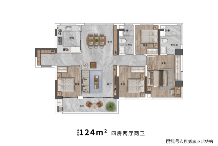 建面约 124㎡户型为竖厅南北对流设计,进门的转角玄关避免直冲餐客厅和主卧,增强空间私密性。