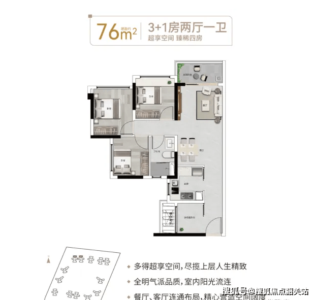 76平方米的3+1房是该项目的入门级产品,专为预算有限但渴望进入天河的刚需客户设计。在有限的面积内,设计师巧妙地规划出三个卧室和一个多功能空间,后者可以根据家庭需求灵活调整为书房、儿童房或客房。这种设计极大地提高了空间利用率,使得小户型也能具备大户型的功能性。餐厅与客厅连通的布局,不仅增加了视觉上的开阔感,也让家庭聚会变得更加温馨。该户型总价较低,是许多年轻家庭上车的理想选择。