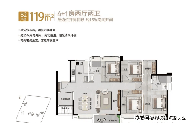 119平方米的4+1房面向的是改善型客户,这类人群通常对居住空间有更高的要求。该户型同样分为竖厅和横厅两种,单边位布局使得南向开间达到15米,采光面极广。四房加一房的配置,可以满足三代同堂家庭的居住需求,每个家庭成员都有独立的空间。主卧配备步入式衣帽间和豪华卫生间,次卧设计也充分考虑了儿童的成长需求。119平方米的户型在天河区内属于性价比极高的改善盘,既有大宅的气派,又没有过高的总价门槛。