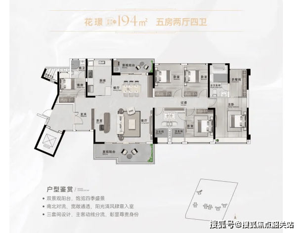 140平方米的五房和194平方米的五房三套间大平层,则是项目的高端产品线。140平方米的五房采用南北对流设计,拥有约32平方米的阔绰客餐厅和16米的南向五开间,直面央景园林,居住体验极佳。194平方米的大平层更是奢华之作,双景观阳台设计,南北通透,主套面积高达32平方米,配备独立衣帽间和豪华卫浴,堪称豪宅标配。这两类户型适合对居住品质有极高要求的终极改善客户。