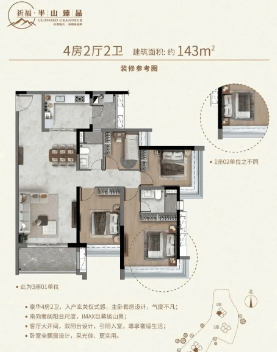 143㎡(4房2厅2卫):大开间的客厅连接南向大阳台,IMAX巨幕般的山景视野,让每一刻都充满诗意。