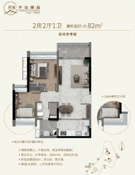 82㎡(2房2厅1卫):实用且布局方正,科学合理的设计使得每个房间都能享受到充足的阳光。