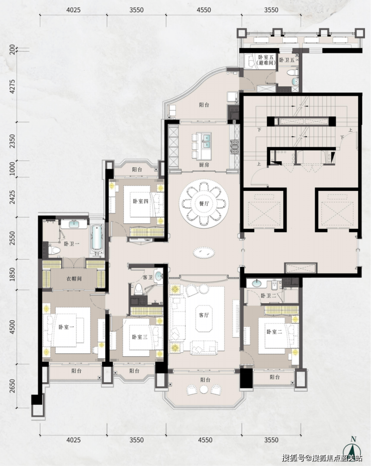 约236㎡的A3星盈淡雅户型,五房三厅五卫的设计,空间布局合理,功能齐全。南北通透的设计,让室内空气流通顺畅,同时奢享江城园景。主卧套房设计,配有独立卫生间和衣帽间,保障了主人的私密性和尊贵感。客厅宽敞明亮,连接超大阳台,可俯瞰江景,是家庭聚会和休闲放松的理想场所。