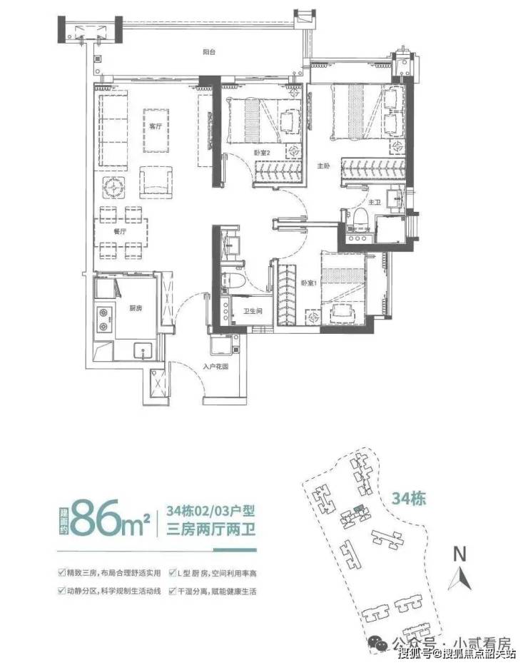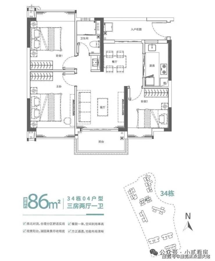 建面约86㎡南北通透三房,南北对流,采光通透,空间视野开阔,布局方正舒适实用,客厅直通南向阳台,引更多清风和阳光入室,缔造质感生活。