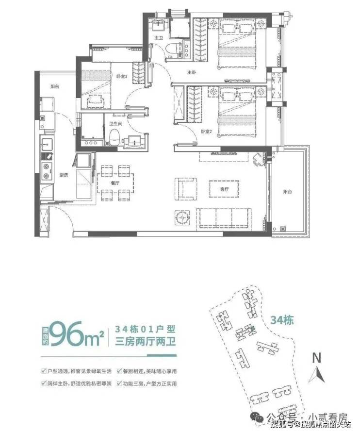 建面约96㎡滨水舒适三房,餐客厅一体化,连通观景阳台,臻藏生活美景,客厅与休息区以科学合理的布局分隔,动静皆从容,卧室均规划大面宽飘窗,放大房间尺度感,营造舒适生活体验。