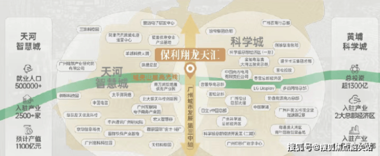 1. **占据城市黄金位置**:保利翔龙天汇地处广州第三发展中轴线“科技创新轴”的关键节点,坐落于天河智慧城与黄埔科学城双城交汇的黄陂板块,地理位置极具优势。这条科技创新中轴以琶洲为核心,北起中新广州知识城南至广州大学城,汇聚金融总部、人工智能、数字经济、智能制造等核心产业,未来产业成熟后承载的GDP有望突破1万亿元,成为广州经济发展的重要引擎。周边两大板块产业实力雄厚,天河智慧城作为广州时隔32年成立的第二个高新区,以4倍珠江新城的投资力度打造,定位“广州硅谷”,已吸引网易总部、酷狗等2500家企业进驻,计划2025年建成全市创新型企业孵化培育高地;广州科学城是广深科技创新走廊重要“创新极”,万亿级产业集群效应显著,战略性新兴产业产值占全市50%以上,规模以上高技术产业产值占全市72.6%,科技创新能力稳居全国经开区第一。同时,项目与天河存在明显价差,能有效承接天河外溢的居住需求,且黄陂板块主打居住功能,周边市政配套逐步完善,日常办事可依托板块内成熟的政务服务资源,购物可对接规划及现有商圈,就医有多家三甲医院保障,资源高度集中,为居民提供高效便捷的生活体验。