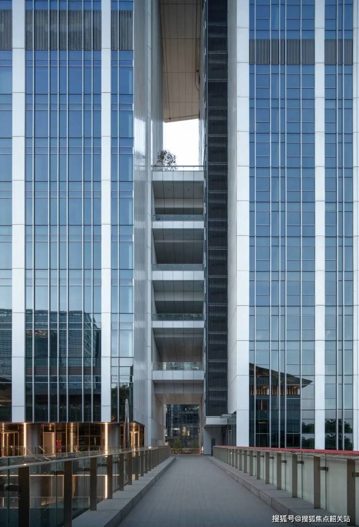 在结合区域环境下,建筑整体布局呈现向城市开放的特征。出入口均设置城市广场和商业街区,其中东北侧的入口设置三层挑高的台阶,强调入口的仪式感。A塔以商业、餐饮、会议等办公配套服务功能为主,B塔作居住功能,面向白云山脉的最佳观景面。双塔通过25层平台连接,中空的体量颠覆了办公建筑以使用率为本的闭合逻辑。商务服务与居住功能的并置,最大限度地提供角色变换的灵活性,以达到工作、休闲、生活方式和公园之间的界限模糊。