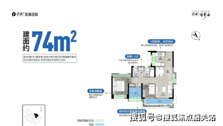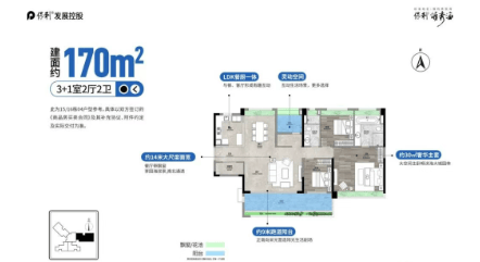 该户型实用率高达 107%,主卧采用 U 型全景飘窗设计,拥有三江汇聚景观面,三开间约 9 米大采光面,通透感强,动区 LDKB 设计,客餐通厅同宽,是刚需上车首选。