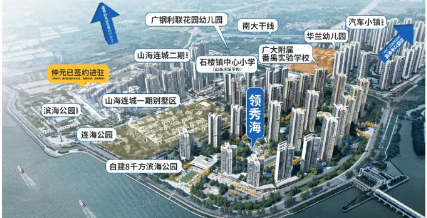 项目景观资源丰富,东南临海,拥有 L 型环幕海景,可俯瞰 1.5km 海景面,东低西高的围合布局,让业主尽享海园双景。自带 3 个园林,景观面约 12 万方,设有 900m 环形跑道、1 个酒店式假日泳池,以及全龄化配套设施,如泛会所场、儿童乐园等,主入口两侧还设滨海花园,为居民营造了舒适的休闲空间。同时,10 分钟可达莲花山,15 分钟可至海鸥岛,居住环境宜人。