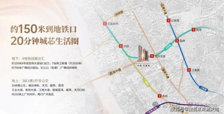 项目步行 200 米即达 8 号线宝岗大道站 C 出口,真正的 "出家门进地铁",乘坐 8 号线 6 站约 15 分钟直达荔湾陈家祠,转 2 号线 4 站约 15 分钟到海珠广场,7 站约 20 分钟可达天河珠江新城,无论是去往老城区还是 CBD 上班都十分便捷。距离广佛线沙园站仅 800 米,步行 14 分钟即可抵达,双地铁出行选择更多元。