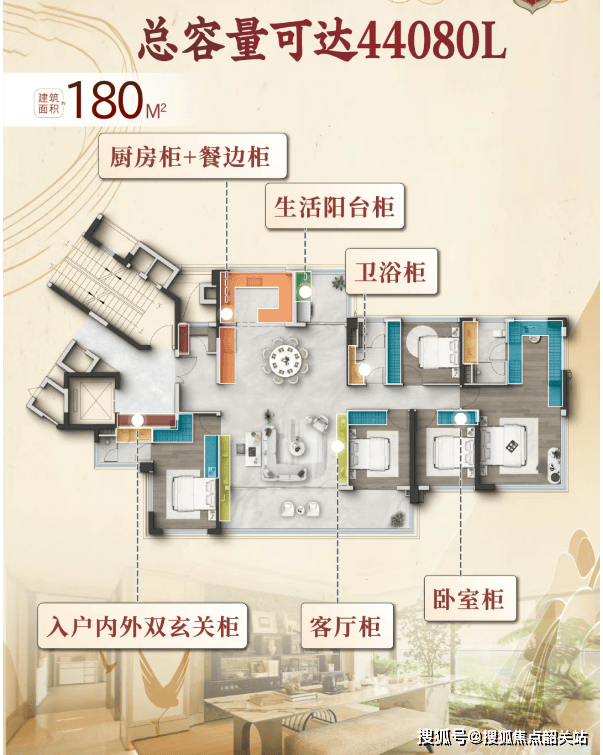 至于建面约180平方米的大平层户型,则是为追求极致居住体验的改善型家庭量身打造。该户型拥有超大的面宽和进深,空间尺度奢阔,功能分区明确且合理。全屋六大模块的收纳容量高达约4.4万升,相当于能放下四百个三十寸行李箱,堪称航母级收纳系统。无论是玄关的鞋帽收纳,厨房的厨具收纳,还是主卧的衣物收纳,都有专门的空间进行规划,确保家中整洁有序。此外,180平方米户型还配备了更高级别的装修标准和智能化系统,如五件套厨电、全屋中央空调、净水系统等,为业主提供了全方位的舒适生活体验。