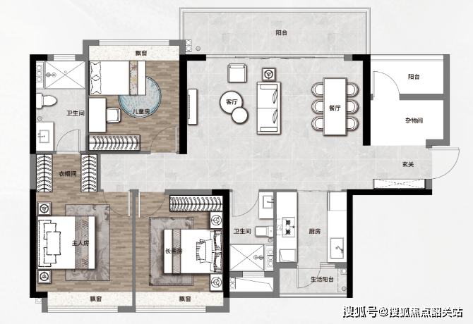 125㎡四房两厅两卫:正南北横厅户型,双阳台南北对流,超6米宽景观阳台,可享受大夫山湖头排景观。
