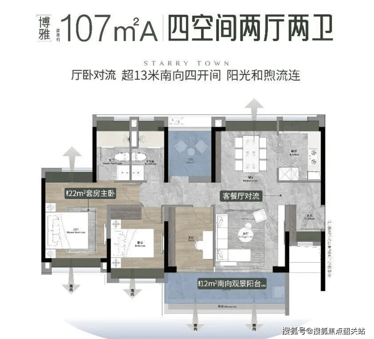 建面约107㎡A四房两厅两卫,专为改善家庭打造:南向观景玄关设计,入户仪式感拉满;4.5开间朝南,客厅与主卧实现双南北对流,通透清爽,远离西晒困扰;双面宽观景阳台+全景飘窗,拓宽空间视野与使用功能;交互式方厅可开可合,适配家庭聚会、居家办公等多场景生活需求,兼顾实用性与舒适度。