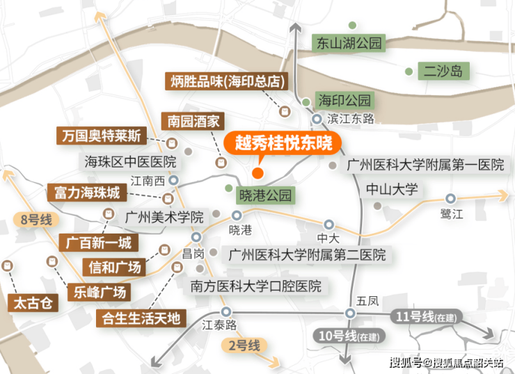 在配套设施上,我们更是倾尽全力。教育方面,项目对口海珠外国语实验中学附属小学(海珠实验小学教育集团),邻近南武实验学校等多所名校,构建了完善的全龄教育体系;医疗方面,5 分钟车程可达广医二院、中山二院南院等三甲医院,广州医科大学附属第一医院海印院区距项目仅约 578 米,为家人的健康保驾护航;交通方面,距离地铁 8 号线晓港站仅约 600 米,步行即可到达,一桥连通东山口,立体路网覆盖全城,30 分钟内即可通达珠江新城、琶洲等核心商圈。